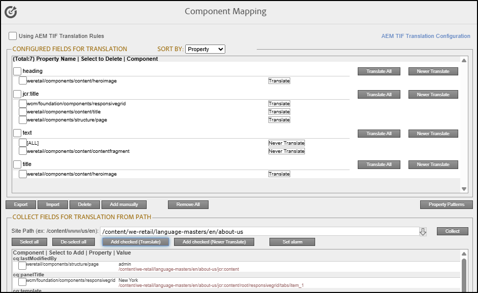 Optional. You can instruct the Connector to collect all properties that are in a specific component for translation. Similarly, you can instruct the Connector to collect all components that have a specific property for translation. You can also remove any component or property from the list, so that the Connector does not collect it to send for translation.